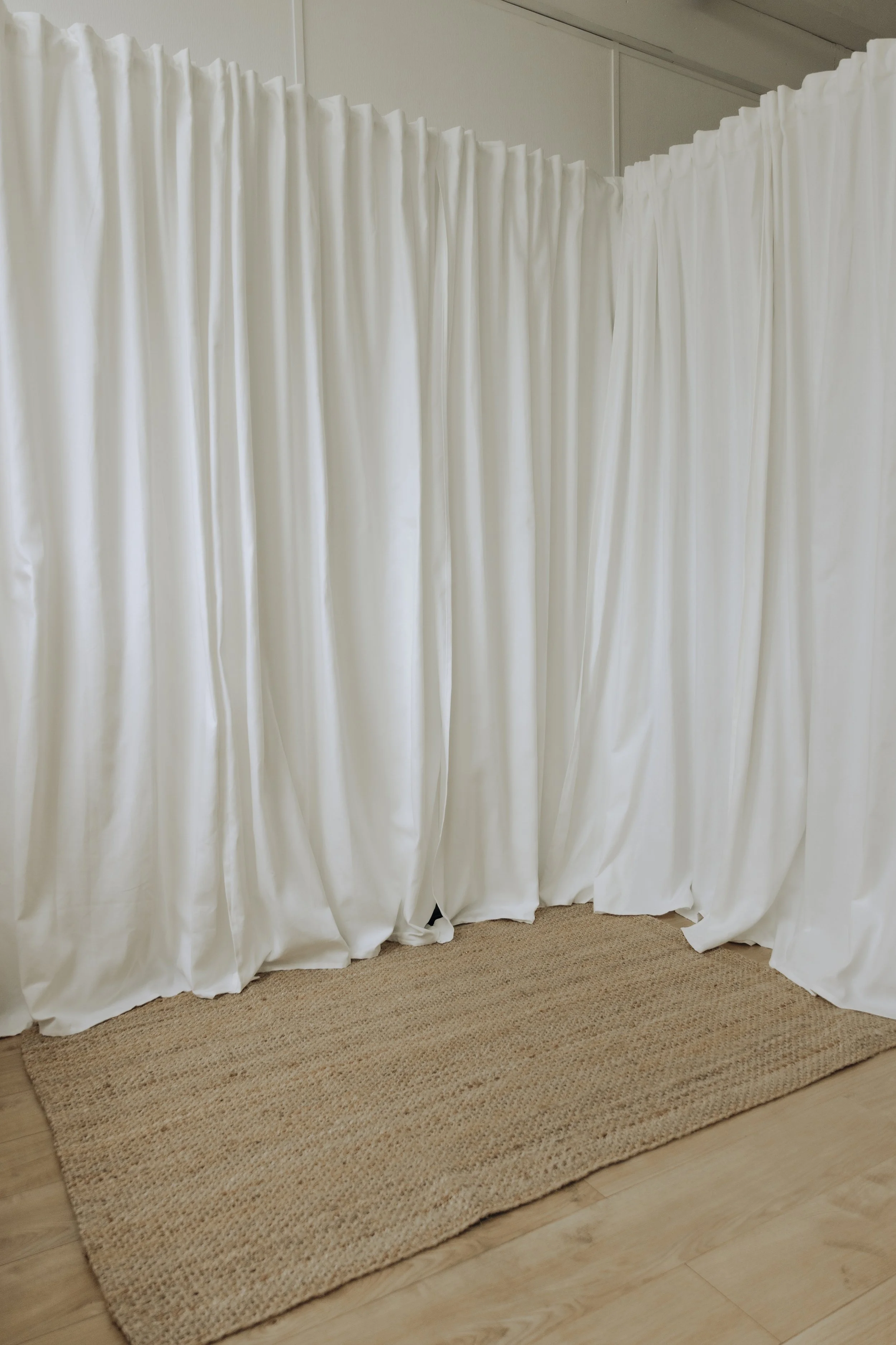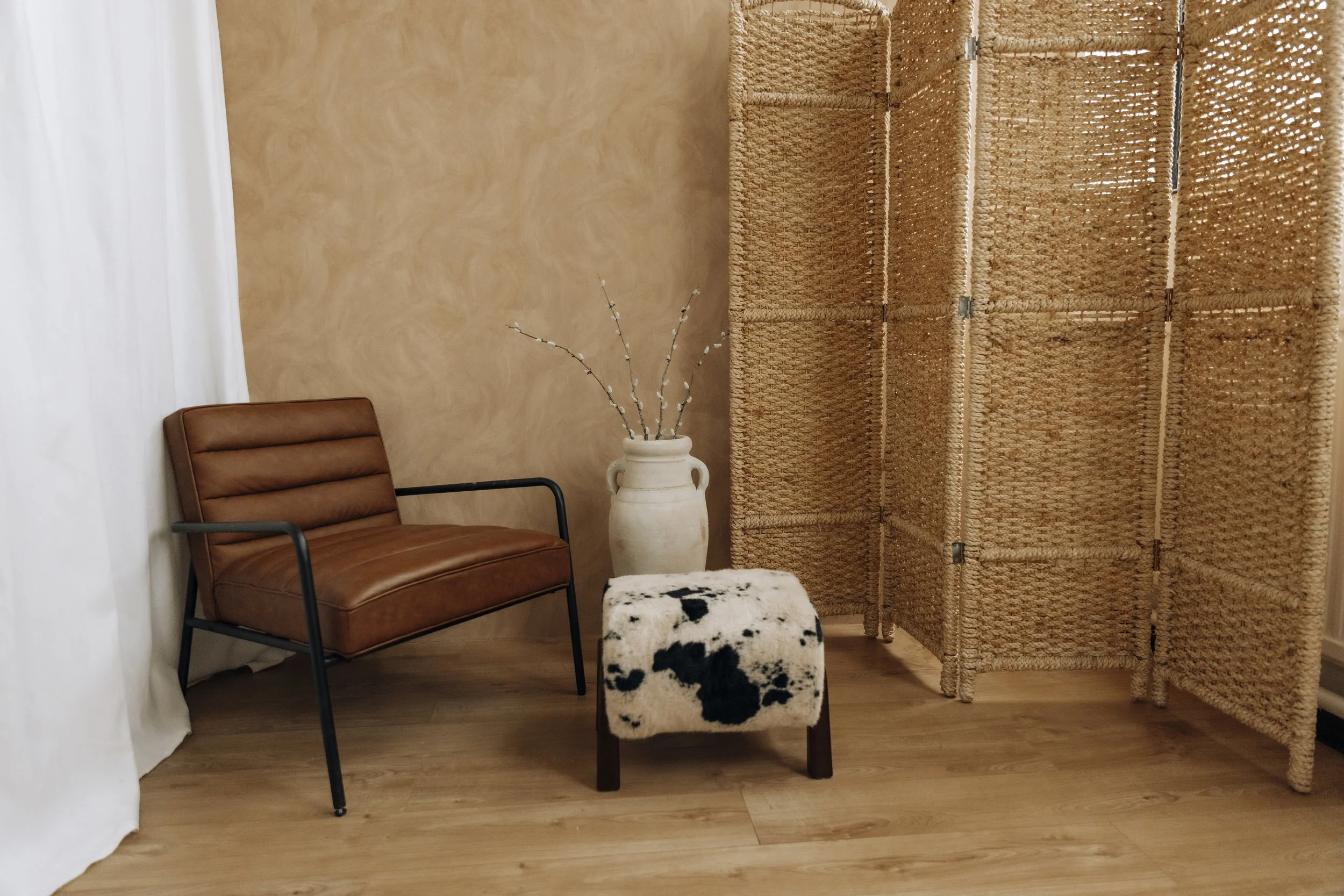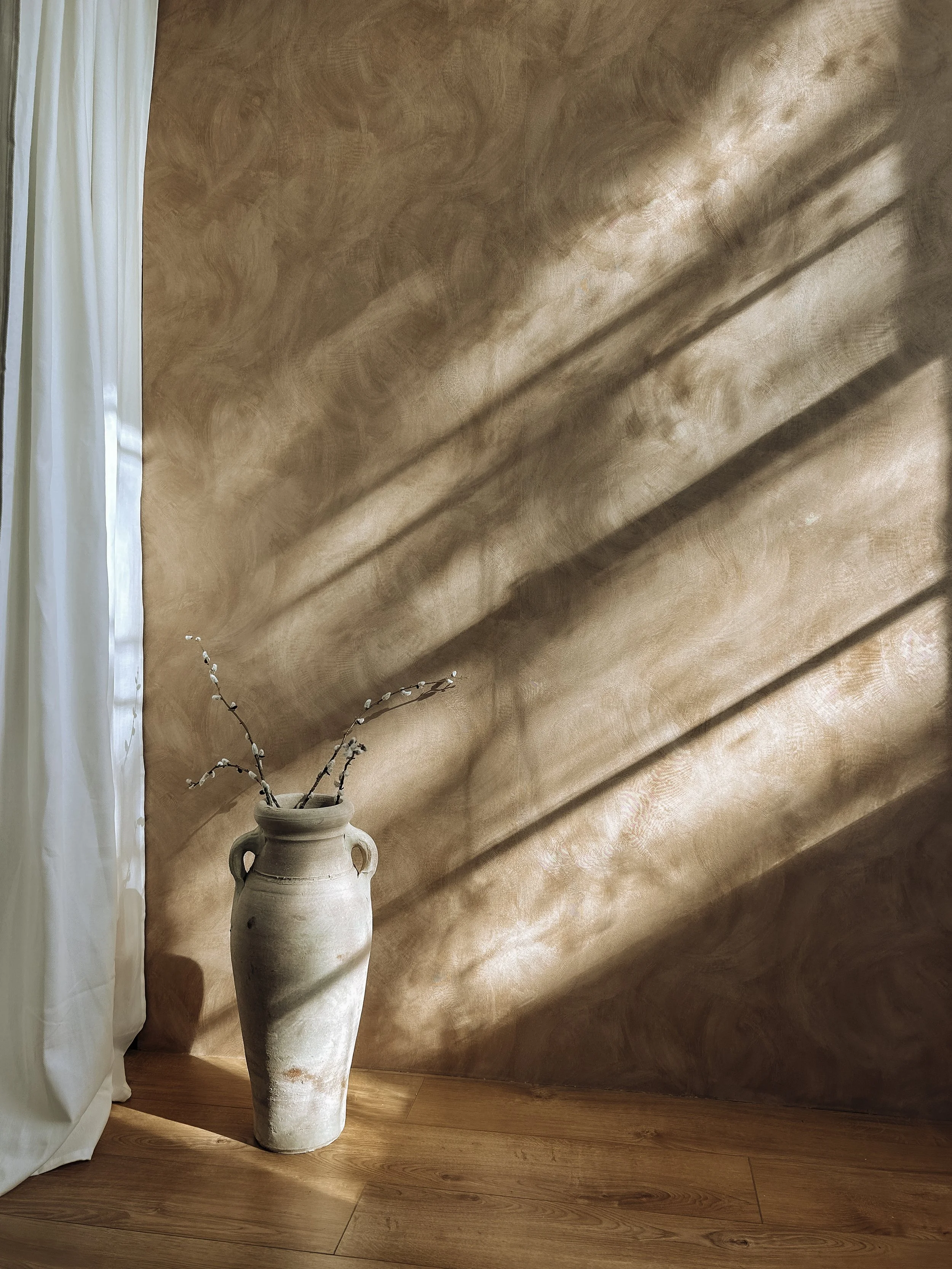 A natural light section with beautiful white curtains one side and a warm, rustic lime-washed wall on the other. When the sun beams through, this beautiful light shadow casts on the wall.