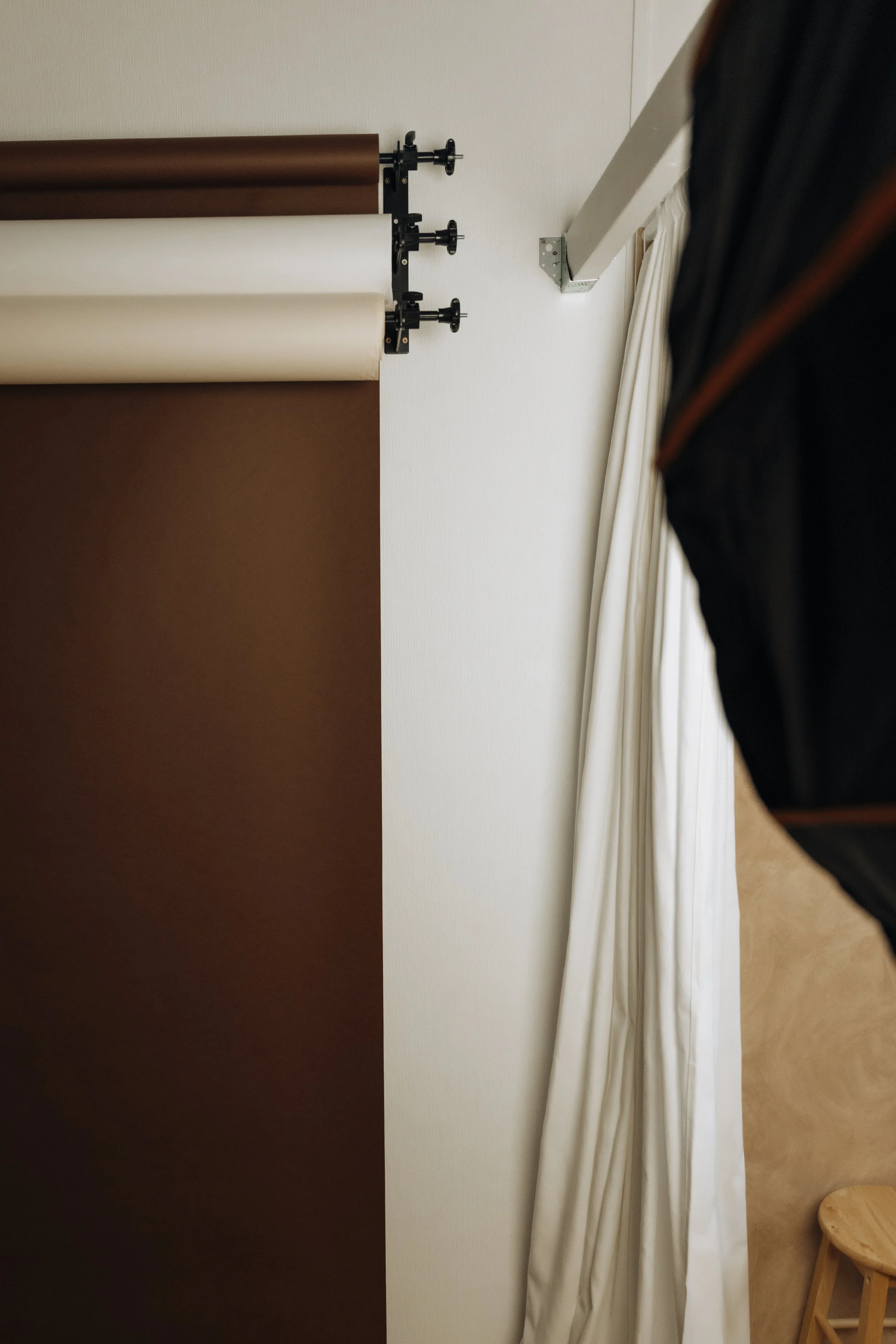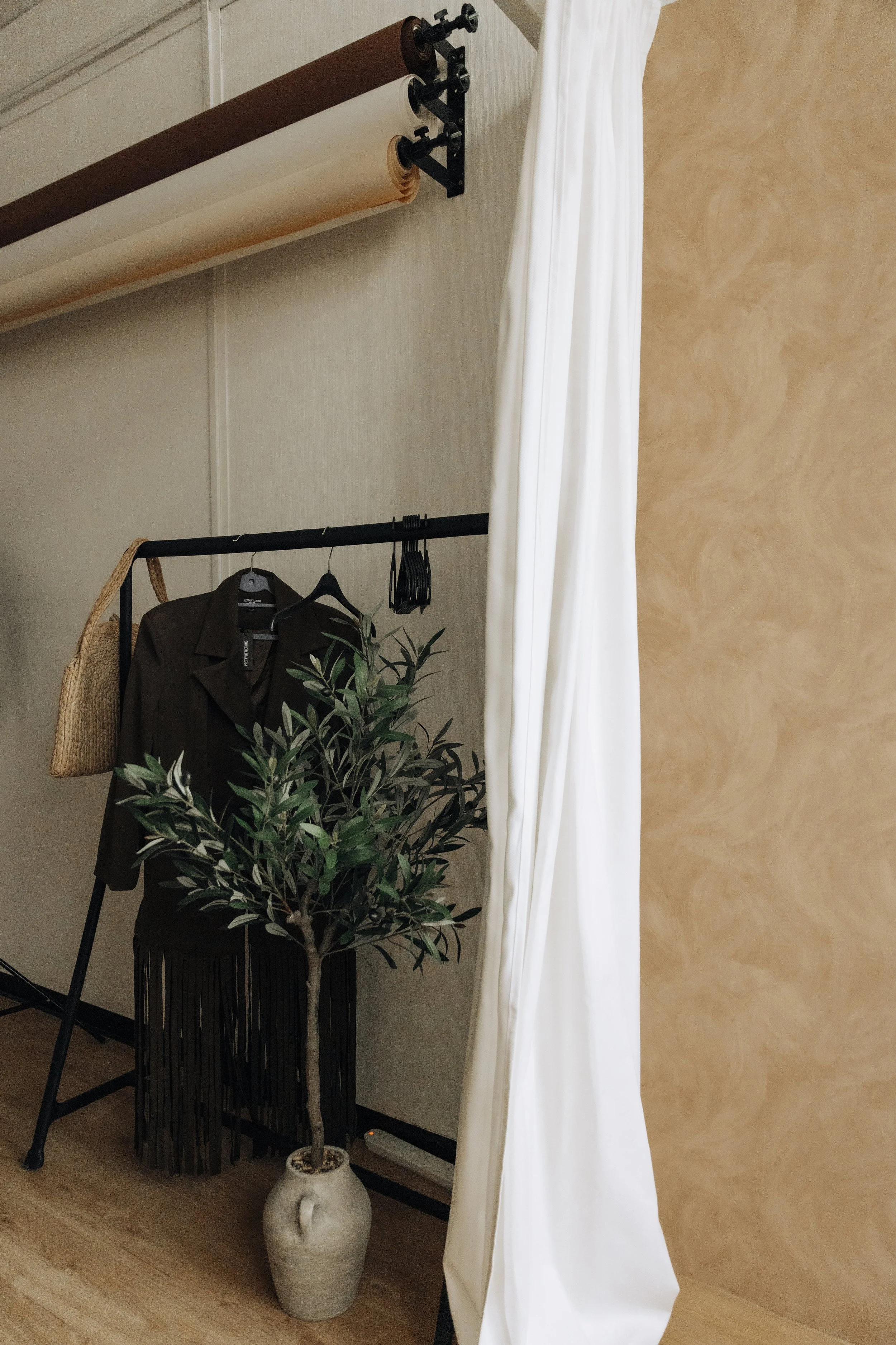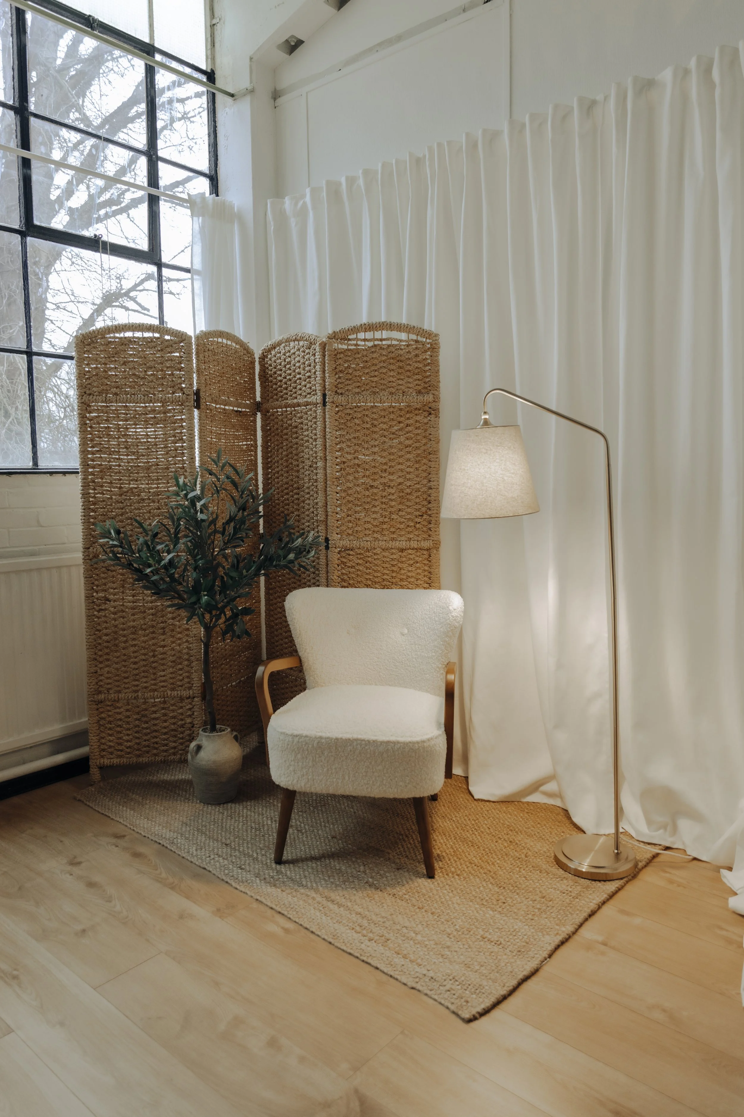 A natural light section with beautiful white curtains one side and a warm, rustic lime-washed wall on the other. When the sun beams through, this beautiful light shadow casts on the wall.